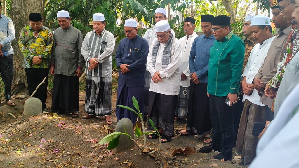 Aceh Besar – Ulama Kharismatik Aceh, Abu H. Hasanul Basri HG atau makruf disapa Abu Mudi Samalanga beserta rombongan bertakziah dan ziarah langsung ke makam makam Tgk H Shalahuddin al-Fata bin Aly as-Su’udy dan berdoa di makam Abu Krueng Kalee di komplek dayah Darul Ihsan, Siem, Darussalam, Aceh Besar, Aceh. (21/5/2022).