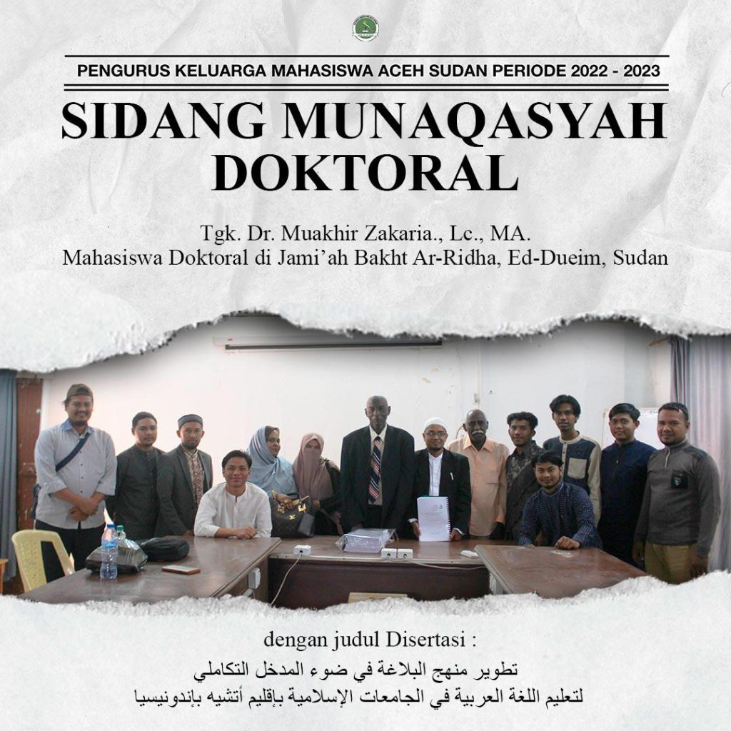 Khartoum, Sudan – Promovendus Dr. Tgk. H. Muakhir Zakaria, S.Pd.I., M.A berhasil memperoleh gelar doktoralnya di University of Bakht Alruda, Sudan. 17 Maret 2022 M/14 Sya’ban 1443 H. Mahasiswa Doktoral asal Peureulak dan sebagai Sekretaris Umum Dayah Darul Ihsan Abu Hasan Krueng Kalee berhasil mempertahankan Desertasi-nya di depan para penguji; (1) Prof. Dr. Shalah Ibrahim […]