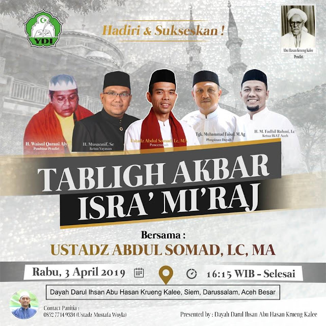 Aceh Besar-Penceramah kondang, ustadz H Abdul Somad, Lc MA (UAS) akan mengisi tausiyah dalam rangka Tabligh Akbar Isra’ Mi’raj Nabi Besar Muhammad SAW yang dilaksanakan di Dayah Darul Ihsan, Siem, Darussalam, Aceh Besar, sore, Rabu, 3 April 2019 mendatang.